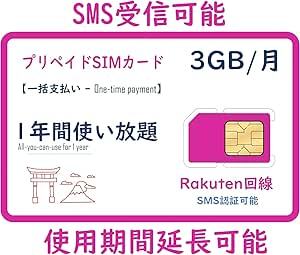 楽天回線 国際ローミング対応] 国内海外 プリペイドSIMカード - 1年間有効 3GBデータ通信用SIMカード(SMS認証可)5G/4G-LTE対応 (月間3GBプラン)